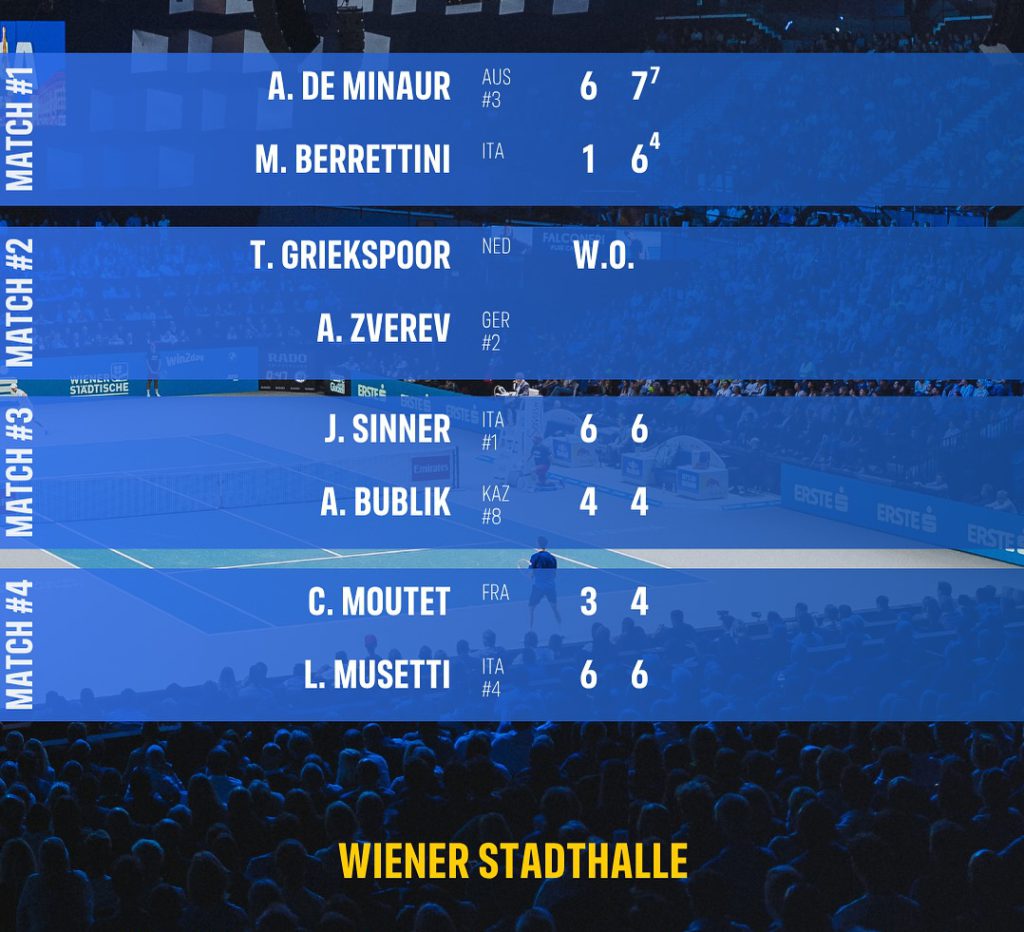 Ci sono due italiani alla semifinale del Vienna Open. Il numero due al mondo, Jannik Sinner, chiude con facilità la partita ai quarti con Aleksandr Bublik (doppio 6-4), e raggiunge la sua terza semifinale del Vienna Open, la 42ma della carriera sul circuito ATP. Lorenzo Musetti ha piegato il francese Corentin Moutet (6-3, 6-4), prendendo punti preziosi nella corsa alle Finals di Torino. Il prossimo avversario di Musetti sarà il tedesco Alexandr Zverev. Sinner affronterà De Minaur, che ha invece eliminato il terzo italiano in gara ai quarti, Matteo Berrettini. “Con lui é sempre dura – ha detto Sinner, riferendosi a Bublik – ho cercato di rimandare di là il maggior numero di risposte, restando solido. Sono molto felice di esserci riuscito”. “Mi sono sentito molto a mio agio. Posso essere solo contento del match di oggi” ha aggiunto. La prova con De Minaur “sarà più difficile, a Pechino è stata dura – ha concluso – e sarà una battaglia dal punto di vista fisico”.